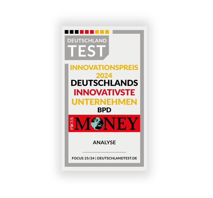 Wir freuen uns sehr, dass BPD 2024 von FOCUS und FOCUS MONEY mit dem DEUTSCHLAND TEST SIEGEL "Deutschlands innovativste Unternehmen" ausgezeichnet wurde! Gerne möchten wir unsere Freude mit Ihnen teilen und Ihnen darstellen, wie Sie als unser Kunde hiervon profitieren.